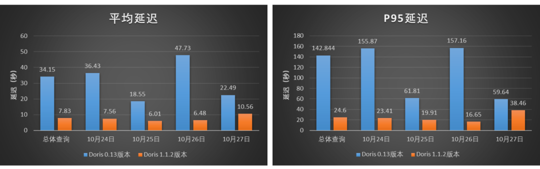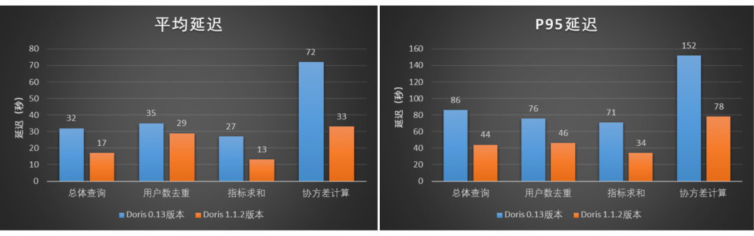 我们选择了 A/B 实验场景中一批典型的用户去重、指标求和以及协方差计算的查询 Case(SQL 总数量为 3245)对两个版本进行并发查询测试,测试表的单日分区数据大约为 31 亿(数据量大约 2 TB),查询的数据范围会覆盖最近一周的分区。测试结果如图所示,Doris 1.1.2 版本相比 Doris0.13版本,总体的平均延迟降低了大约 48%,P95 延迟降低了大约 49%。在该测试中,Doris 1.1.2 版本相比 Doris0.13 版本的查询性能提升了接近 1 倍。