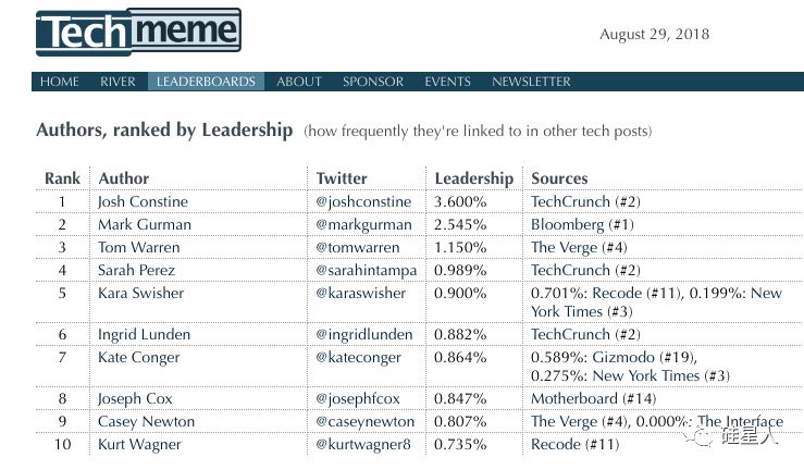 除了呈现新闻标题和链接之外,Techmeme 还设有一个媒体和记者榜单,统计一段时期内哪个媒体的记者被 Techmeme 收录的较多,然后留下该记者的 Twitter 用户名,方便读者直接在社交网络上追踪新闻。