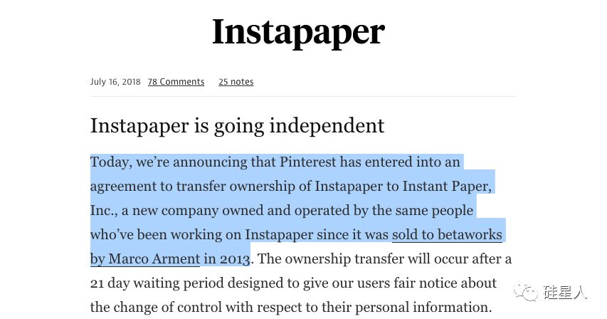 2018年夏天,Instapaper 从 Pinterest 剥离,由新成立的 Instant Paper LLC 运营,团队还是 P 站收购其之前的团队。