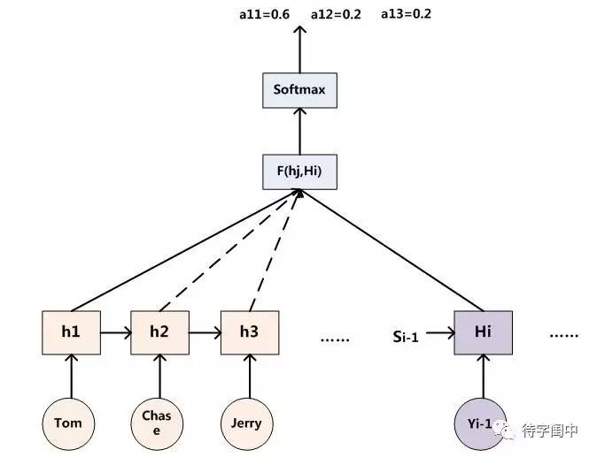 对于采用RNN的Decoder来说,如果要生成yi单词,在时刻i,我们是可以知道在生成Yi之前的隐层节点i时刻的输出值Hi的,而我们的目的是要计算生成Yi时的输入句子单词“Tom”、“Chase”、“Jerry”对Yi来说的注意力分配概率分布,那么可以用i时刻的隐层节点状态Hi去一一和输入句子中每个单词对应的RNN隐层节点状态hj进行对比,即通过函数F(hj,Hi)来获得目标单词Yi和每个输入单词对应的对齐可能性,这个F函数在不同论文里可能会采取不同的方法,然后函数F的输出经过Softmax进行归一化就得到了符合概率分布取值区间的注意力分配概率分布数值。图5显示的是当输出单词为“汤姆”时刻对应的输入句子单词的对齐概率。绝大多数AM模型都是采取上述的计算框架来计算注意力分配概率分布信息,区别只是在F的定义上可能有所不同。