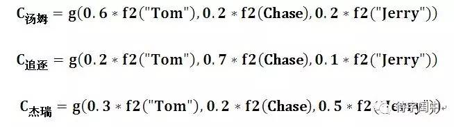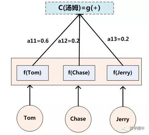 假设Ci中那个i就是上面的“汤姆”,那么Tx就是3,代表输入句子的长度,h1=f(“Tom”),h2=f(“Chase”),h3=f(“Jerry”),对应的注意力模型权值分别是0.6,0.2,0.2,所以g函数就是个加权求和函数。如果形象表示的话,翻译中文单词“汤姆”的时候,数学公式对应的中间语义表示Ci的形成过程类似下图: