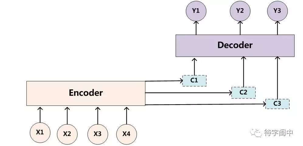 为了便于说明,我们假设对图1的非AM模型的Encoder-Decoder框架进行细化,Encoder采用RNN模型,Decoder也采用RNN模型,这是比较常见的一种模型配置,则图1的图转换为下图: