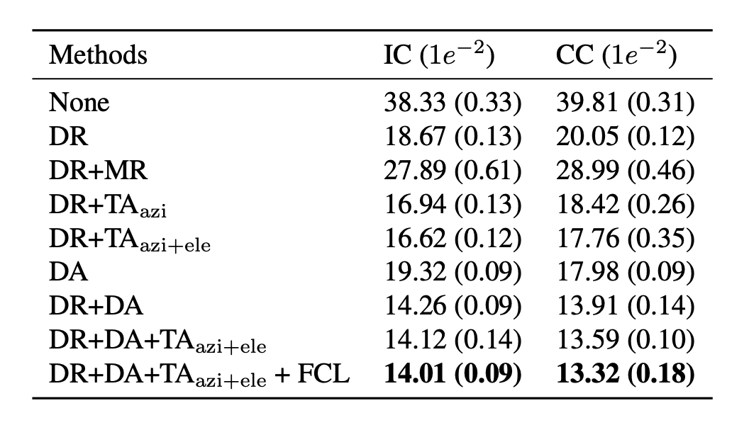 ShapeNet1D 姿态估计误差。结果是用 5 个随机种子计算的平均误差(MAML除外。第一行显示 IC 的结果,第二行显示 CC 的结果。