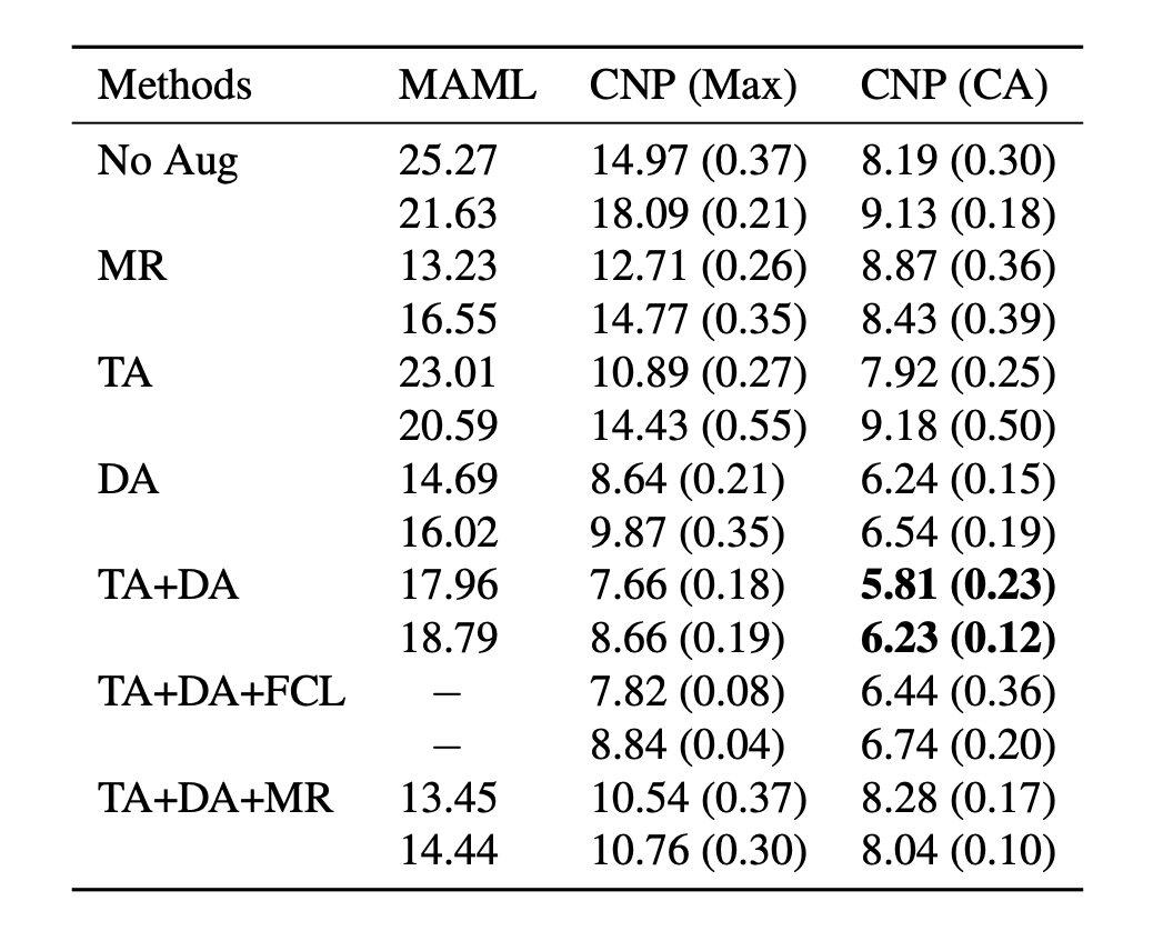 实验结果表明,由于损失函数选择不当以及元训练集太小,先前工作的结果具有误导性。具体来说,我们发现在没有微调的情况下,CNPs 在大多数任务上都优于 MAML。此外,我们观察到没有针对设计的任务增强会导致严重的欠拟合。