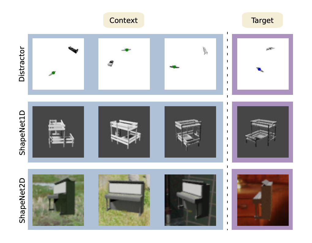 其中 ShapeNet1D 包含与 Pascal1D 一样的一维旋转,但具有更大的物体多样性,ShapeNet2D 则具有二维旋转和随机背景。在这个任务中,每个对象都有一个随机的规范姿势,因此它必须从上下文集