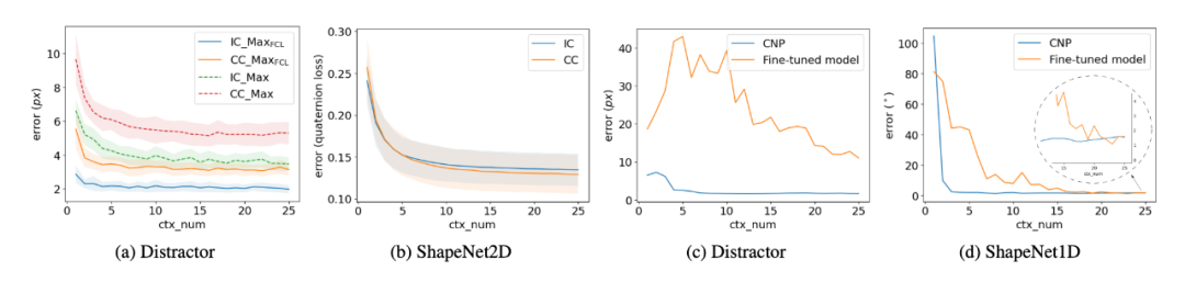 (a) 使用 Max 聚合和 Max + FCL 在 Distractor 任务中 CNP 预测误差(像素)与上下文对数的关系。包括类别内 (IC) 和跨类别 (CC) 级别的新对象的评估结果。(b) 使用 DA + TA 的 ShapeNet2D 任务中 CNP (CA) 预测误差与上下文对数的关系。(c) 我们比较了经典的目标检测方法和 CNP (Max) 在新任务上使用不同数量的数据在 Distractor 上进行训练。经典模型在每个新任务上都会进一步微调训练。(d) 微调模型与 CNP (CA) 在 ShapeNet1D 上的预测误差。