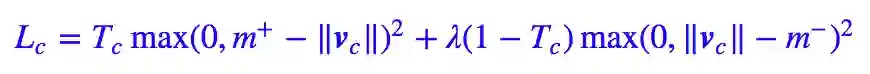 事实上,Capsule 做的事情就是检测有没有这个类,也就是说,它把一个多分类问题转化为多个 2 分类问题。因此它并没有用普通的交叉熵损失,而是用了: