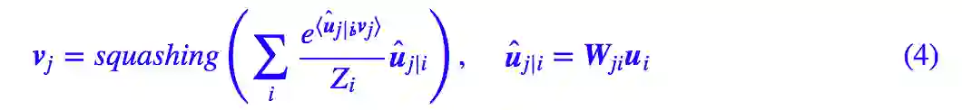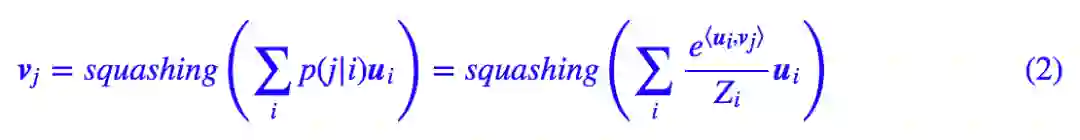 从上往下看,那么 Capsule 就是每个底层特征分别做分类,然后将分类结果整合。这时 vj 应该尽量与所有 ui 都比较靠近,靠近的度量是内积。