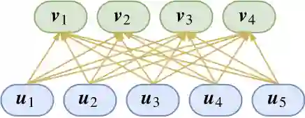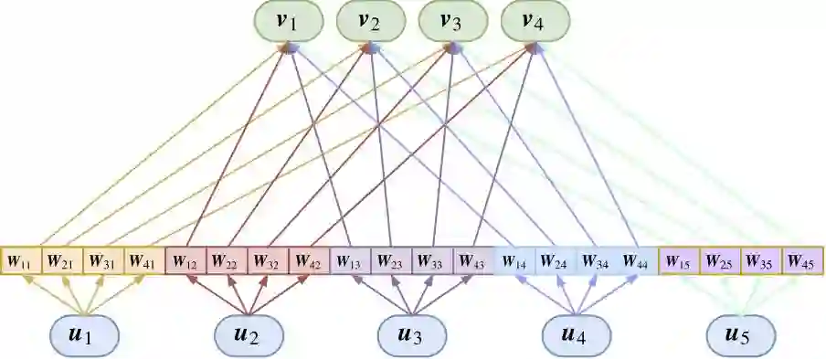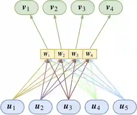 图上只展示了 u1 的连接。这也就是说,目前已经有了 u1 这个特征(假设是羽毛),那么我想知道它属于上层特征 v1,v2,v3,v4(假设分别代表了鸡、鸭、鱼、狗)中的哪一个。