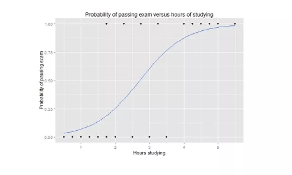 逻辑回归曲线图,显示了通过考试的概率与学习时间的关系。