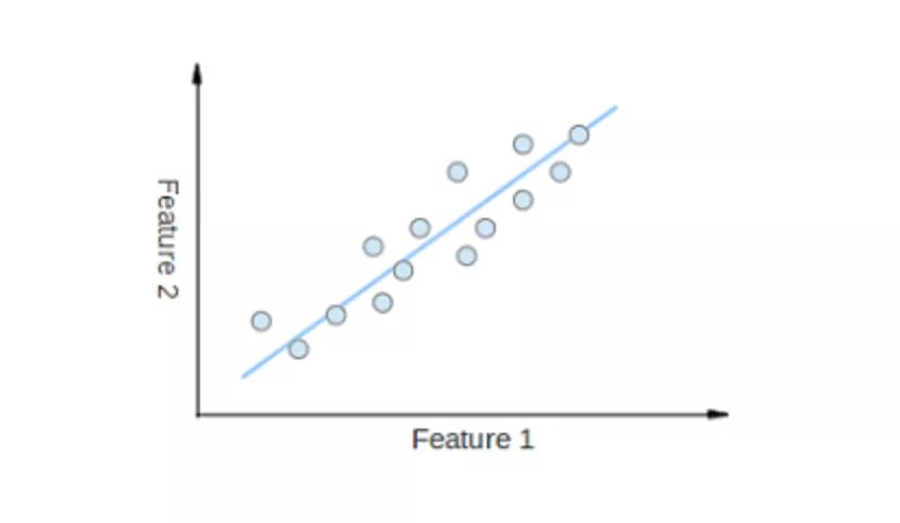 可以通过将所有数据点近似到一条直线来实现降维的示例。