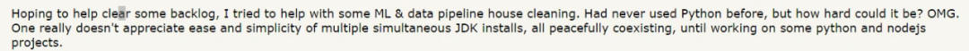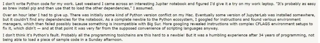 Reddit/HN 上的有些人更粗鲁:你甚至不会安装 Python 或某个版本,你一定是个傻瓜。有一个人告诉我,非常非常严肃:你只要学会使用 virtualenv,你所有的问题就都不存在了。好吧,谢谢,好像我没那样想过是的。