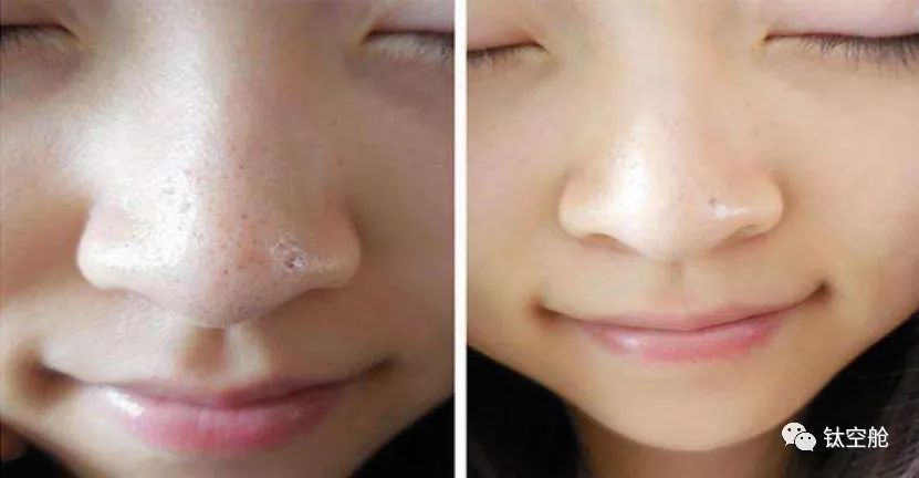 吸黑头仪平行于黑头进行作用,利用变频脉冲吸力,能够有效地将黑头连根拔起,不会将黑头根部残留在皮肤深层,同时也不会对周围的肌肤造成撕扯等伤害。使用前后对比图▼