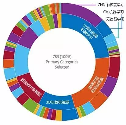 CVPR 2017 接收论文领域分布情况。本次大会共接受 783 篇论文,内环表示主要分领域,外环表示次要分领域。内环右上角开始,顺时针依次显示了论文数量从多到少的主要分领域。最大的蓝色部分代表机器学习,接下来的红色代表物体识别和场景理解,再接着的蓝色表示 3D计算机视觉。其他颜色对应内容详见下面列表。