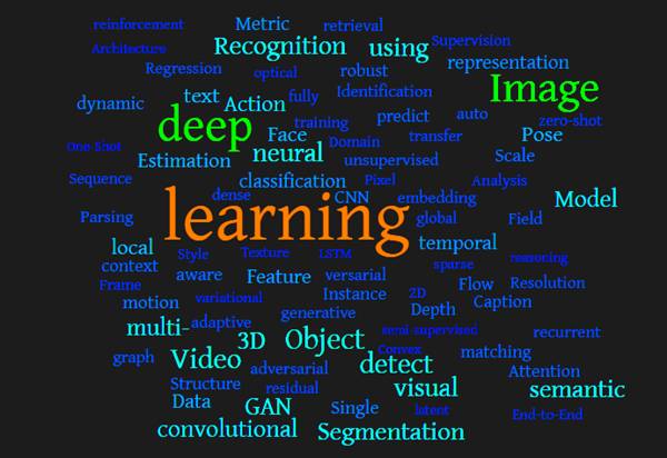 我们根据接收论文的题目做了粗略的热词统计(见上面这张云图)——“深度学习”毫无意外地是最热关键词。同时,Image、Object、Video 等词出现频率也很高,这很好理解,因为 CVPR 是计算机视觉会议。同样,识别、检测、分类和卷积、残差(网络)等也是高频词。