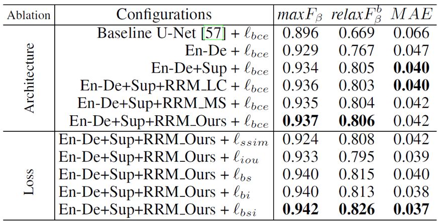 是边界评价标准,可以参考文献 [3]。下面是各种 loss 的情况下,显著性检测的效果,在传统困难的多物体重合与背景差别不大的情况下,从效果图中能看到三种 loss 一起的效果跟有结构性损失的效果都表现的不错。