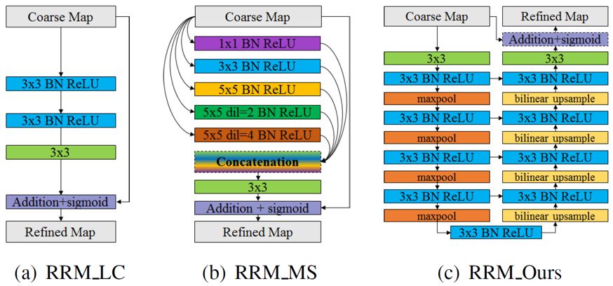 ▲ Figure 4. (a) local boundary refinement module RRM_LC; (b) multi-scale refinement module RRM_MS; (c) our encoder-decoder refinement module RRM_Ours