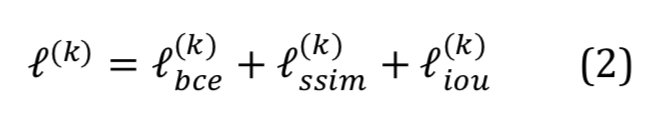 是结构相似性损失,SSIM 就是 structural similarity index 的意思,这是本文关注边界的重点部分,是为了评估图片质量的,捕捉结构化信息,是用于学习显著性目标与 GT 之间的结构化信息的。结构相似性损失的表达如上面的公式(3)所示。