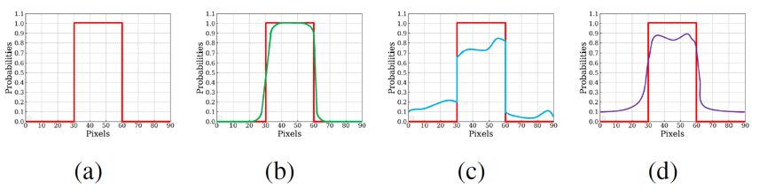 ▲ Figure 2. (a)红色:GT(Ground Truth,以下都简称GT)的概率图,(b)绿色:粗糙边界与GT不对齐,(c)蓝色:粗糙区域内部判定概率也低,(d)紫色:粗糙的预测通常都有这两个问题。