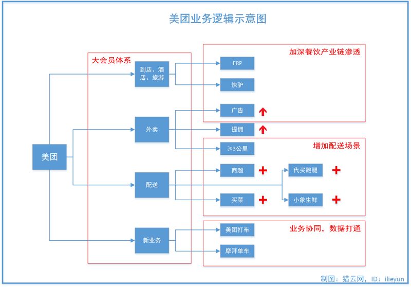 提高营收,围绕着交易金额和变现率,美团的战术有两个方向,一个是扩大,一个是提高。扩大的是交易额,增加交易场景,提高的是变现率。