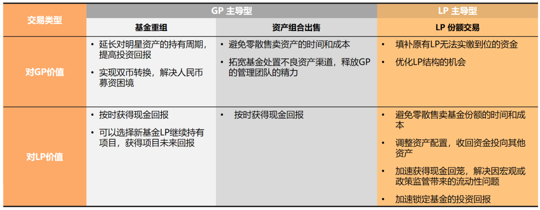 已为中国大部分GP所熟悉的是LP主导型交易模式,更多是LP出于流动性考虑而产生的LP之间的份额转让,因其难为VC/PE基金的管理规模带来增量,所以GP一般没有驱动力积极配合尽调、工商变更等S交易环节。
