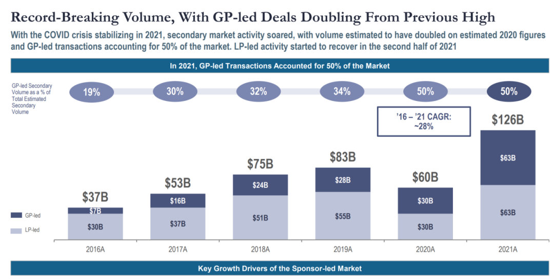 经过20多年的发展,这种创新的金融工具在国外已步入里程碑式发展,标志性事件是2021年GP主导的S交易首次超过LP主导的交易规模,并呈现出持续增长的态势。根据美国Jefferies最新数据显示,GP主导的交易量从2020年的350亿美金增加到2021年的680亿美金,占S市场交易量的一半以上,其中,接续基金(S交易中的一种模式)占大部分比例。这份调研也得到Lazard的数据验证。