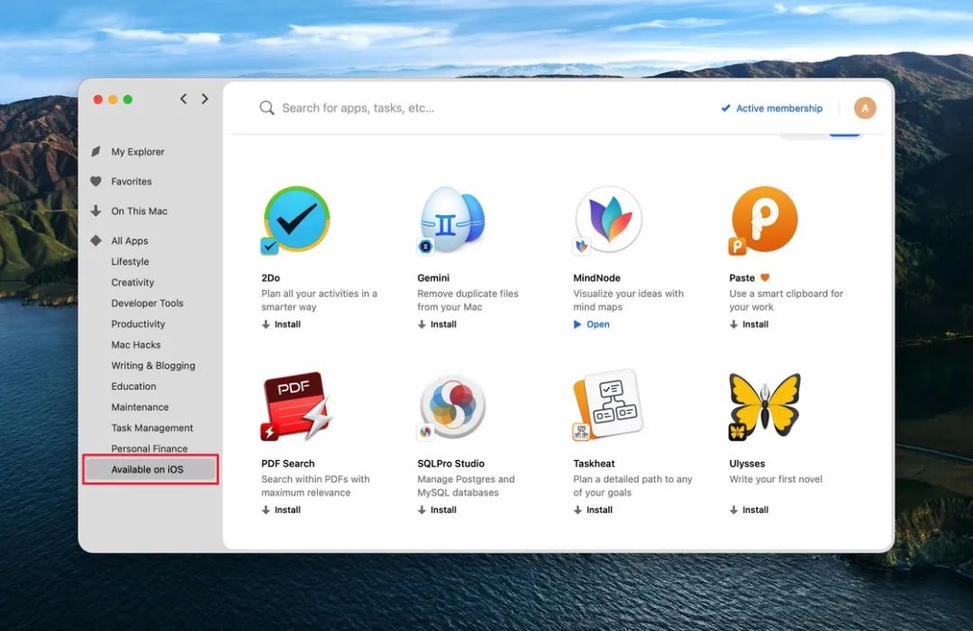 在 Setapp 中支持 iOS 端订阅的也做了明显的标示,除了侧边栏的「Available on iOS」之外,应用图标左下角还会带有小 logo 标记,即 iOS 端的 App 图标。