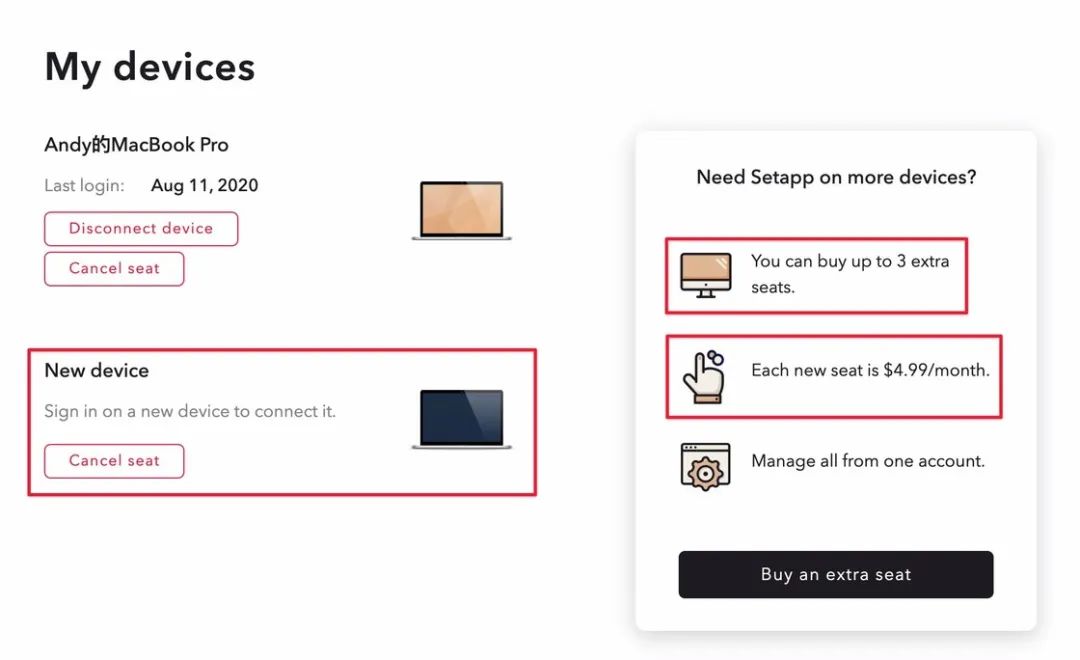 在 8 月 6 日推送更新的 v2.7 版本中,Setapp 采用了新的 iOS 应用付费功能解锁方式,需要额外购买新的设备席位,将 iOS 设备作为订阅计划中的子设备,这样一来对于 iOS 设备的数量限制更为严格了。