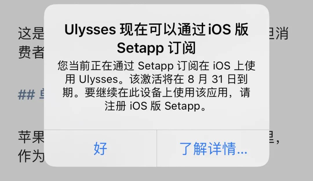 作为 Setapp 中最受欢迎的应用之一,Ulysses 在适配新的解锁机制的同时也提供了一段时间的缓冲期。在 8 月 31 日之前,通过 iCloud 账户解锁付费功能的还能继续使用,之后就需要在 Setapp 购买新的子席位。