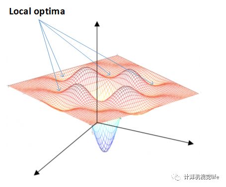 由之前我们公式推导其实可以看出,算法遇到梯度为零的情况下,就会结束迭代,我们只是假设只存在一个全局最小值点梯度为零,而现实中,可能存在局部最小值或者鞍点造成算法失效,因为鞍点和局部最小值梯度同样为零,参照下面的展示图,如果梯度下降求解时遇到鞍点或者局部最小值,会造成算法误认为找到全局最优解而停止迭代,对于如何避免上述问题,有一些解决方案,这里并不展开阐述,以后有机会专门写文章阐述。