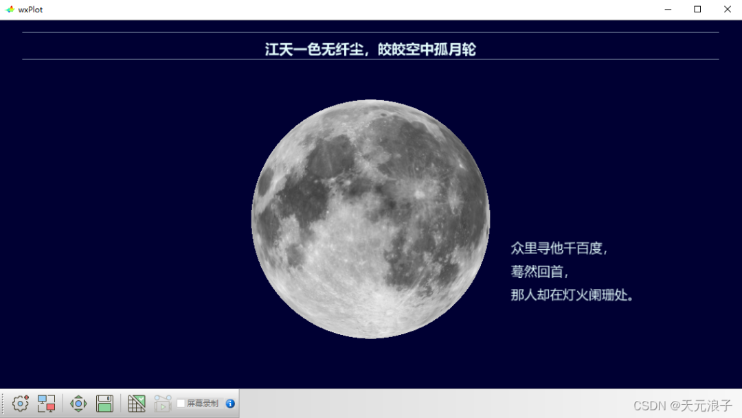 import wxgl.wxplot as pltplt.title('江天一色无纤尘,皎皎空中孤月轮')plt.uvsphere((0,0,0), 1, lon=(0,360), lat=(90,-90), texture='res/moon.jpg', light=None)plt.text('众里寻他千百度,', pos=(1.2,-0.3,0), size=128)plt.text('蓦然回首,', pos=(1.2,-0.5,0), size=128)plt.text('那人却在灯火阑珊处。', pos=(1.2,-0.7,0), size=128)plt.show()