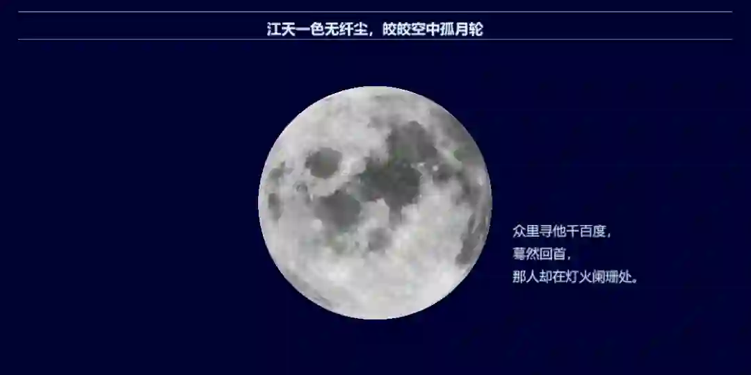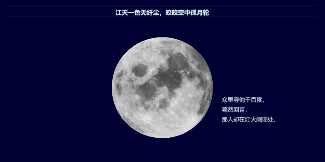 import wxgl.wxplot as pltplt.title('江天一色无纤尘,皎皎空中孤月轮')plt.uvsphere((0,0,0), 1,lon = (0,360),lat = (90,-90),texture = 'res/moon.jpg',transform = lambda duration : ((0, 1, 0, (0.02*duration)%360),),light = None # 关闭灯光效果,环境光会自动增强)plt.text('众里寻他千百度,', pos=(1.2,-0.3,0), size=128)plt.text('蓦然回首,', pos=(1.2,-0.5,0), size=128)plt.text('那人却在灯火阑珊处。', pos=(1.2,-0.7,0), size=128)plt.show()