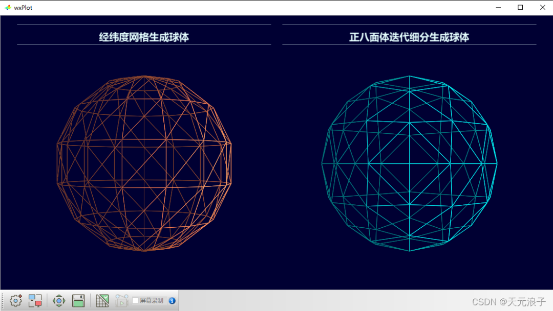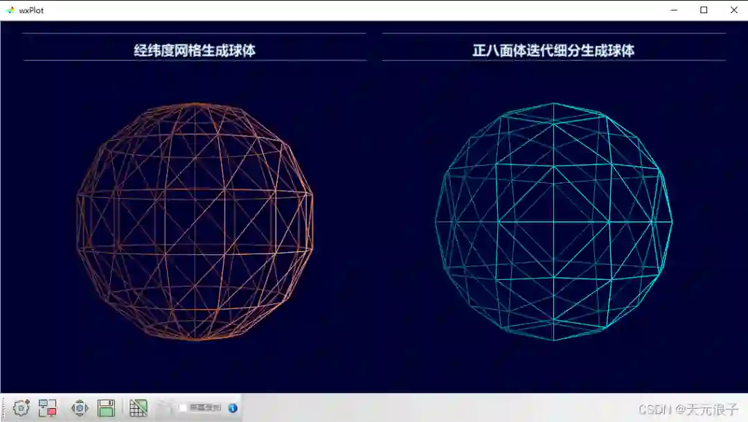 import wxgl.wxplot as pltplt.subplot(121)plt.title('经纬度网格生成球体')plt.uvsphere((0,0,0), 1, color='coral', fill=False, slices=15)plt.subplot(122)plt.title('正八面体迭代细分生成球体')plt.isosphere((0,0,0), 1, color='cyan', fill=False, iterations=2)plt.show()