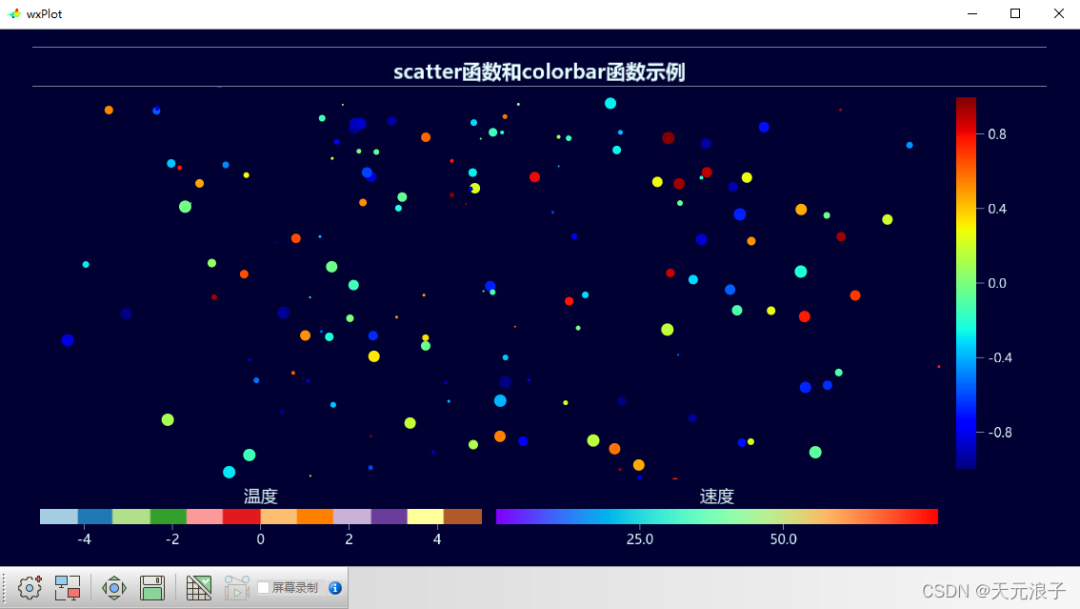 import numpy as npimport wxgl.wxplot as pltvs = np.random.random((300, 3))*2-1color = np.random.random(300)size = np.random.randint(3, 15, size=300)plt.scatter(vs, color, 'jet', size=size)plt.colorbar('jet', [-1, 1], loc='right')plt.colorbar('Paired', [-5, 5], loc='bottom', subject='温度')plt.colorbar('rainbow', [0, 77], loc='bottom', subject='速度')plt.title('scatter函数和colorbar函数示例')plt.show()