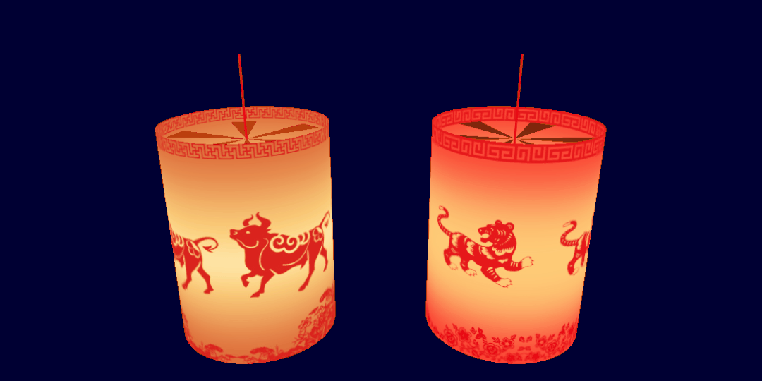 两只花灯使用相同的尺寸,画在同一个位置。花灯筒和叶轮的模型动画函数除了旋转还分别向左右移动了1.2个长度单位,而灯和线则只移动不旋转。最终效果如下图所示。