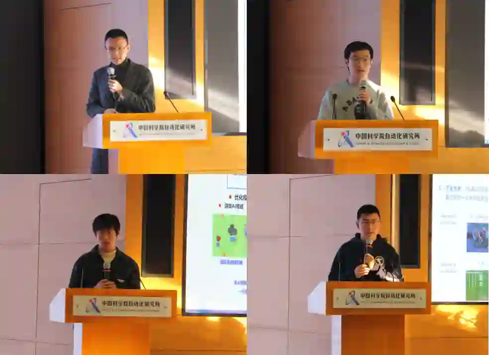 随后,实验班博士研究生桂美将、臧一凡、李涛、孟令辉分别进行了学术交流报告,汇报了近期在机器人仿生触力觉、多智能体博弈系统激励学习机制、动态系统优化指标定量推理与决策、多智能体通用编码与结构算法等研究课题的深入再认识,与会专家现场进行了研讨和指导。