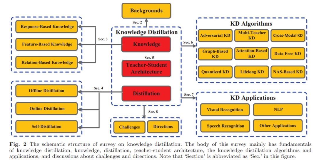 本文对知识蒸馏的研究进行了综述。本综述的主要目的是1) 全面概述知识蒸馏,包括动机的背景,基本符号和公式,以及几种典型知识,蒸馏和算法; 2) 全面回顾知识蒸馏的最新进展,包括理论、应用和在不同现实场景下的扩展; 3) 从知识迁移的不同角度,包括不同类型的知识、训练方案、知识提炼算法/结构和应用,阐述知识蒸馏的一些挑战和见解。本文组织概况如图2所示。具体地说,本文的其余部分结构如下。第二节给出了知识蒸馏的重要概念和常规模型。知识和蒸馏的种类分别在第3节和第4节中进行了总结。现有的关于知识提炼中的师生结构的研究在第5部分进行了说明。第6节对许多最新的知识蒸馏方法进行了全面的总结和介绍。知识蒸馏的广泛应用将在第7节的不同方面加以说明。第8节讨论了知识蒸馏中具有挑战性的问题和未来的方向。最后,在第9节给出结论。