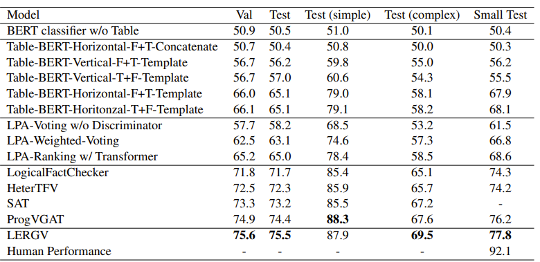 我们在大规模数据集TabFact[1]上进行了实验,其训练集、验证集、测试集大小分别为92283、12792、12779,测试集包含简单与困难两种模式,大小分别为4171和8608,此外还包含一个大小为2K的人工评价集。