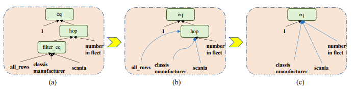此外,观察到,逻辑表达式中有些节点是“工具”节点,其被设计用来在表格上执行,但其本身与输入的自然语言语句之间是语义不相关的(例如, “filter_eq”, “hop”等等),为了更好的利用证据信息,我们设计了一个动态剪枝的方法来自动移除这些节点,如图4所示。具体来说,我们为图中的每个节点打分,然后根据分数以概率θ来移除分数最低的节点,分数的计算方法如下:
