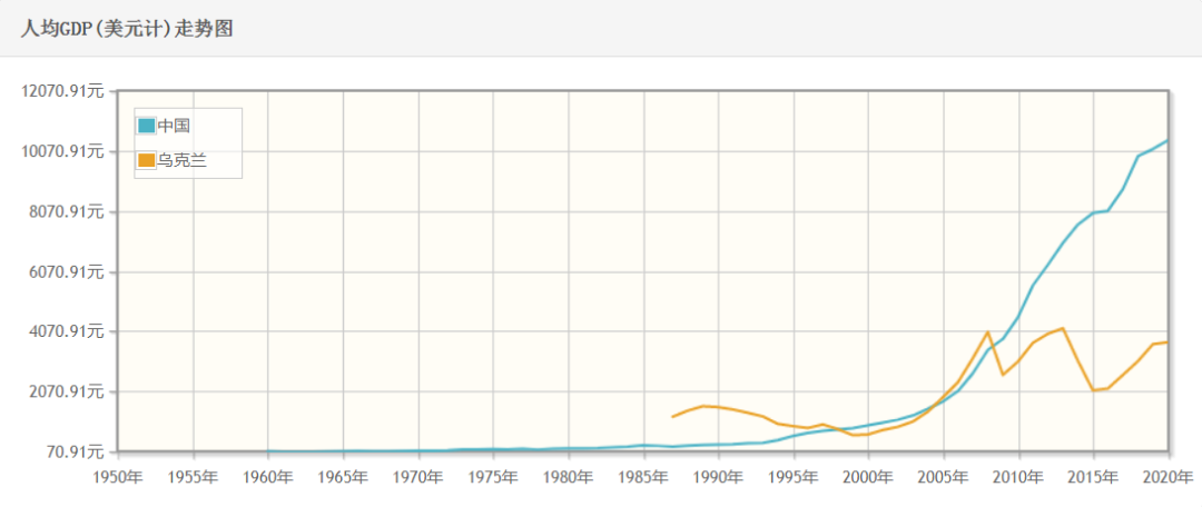 但是,30年来的独立发展过程中,乌克兰的生产总值经历了大幅上涨又迅速回落的波折变化。1990年,乌克兰的人均GDP为1568美元,而当时中国的人均GDP仅为乌克兰的1/5;到2020年,中国的人均GDP已经达到了乌克兰的3倍。2018年,乌克兰被国际货币基金组织(IMF)认证为“欧洲最穷国家”。