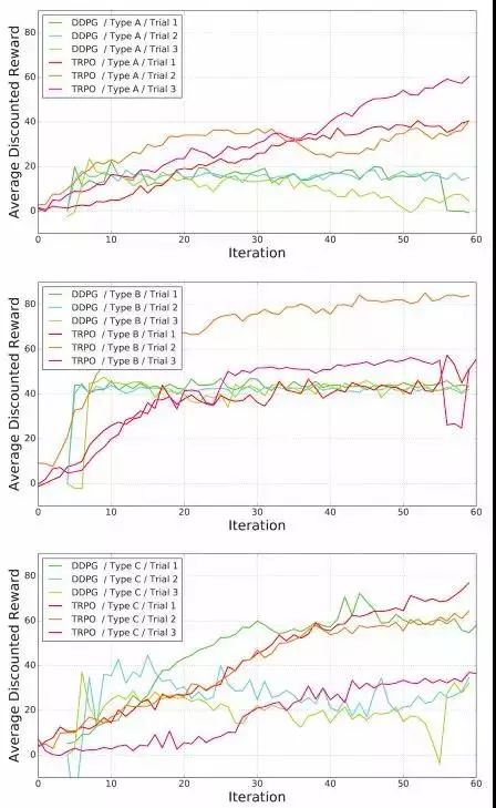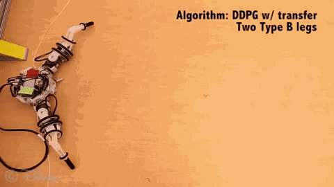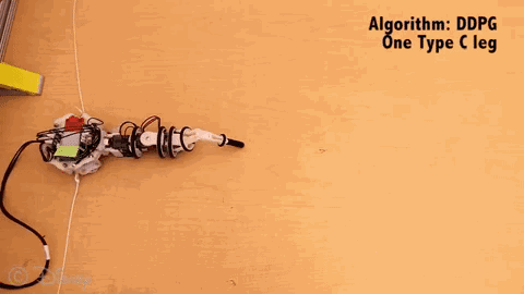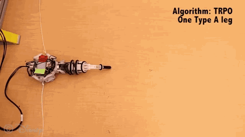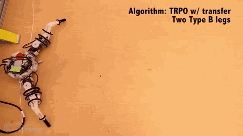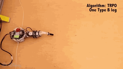 实验人员应用了两种先进的深度学习算法——Trust Region Policy Optimization(TRPO)和Deep Deterministic Policy Gradient(DDPG),这两种算法可以训练神经网络做简单的前进和爬行动作。利用搭建好的环境,上述两种算法都能在高度随机的硬件和环境条件下有效学习简单的运动策略。实验人员将这种学习迁移到了模块化有腿机器人上。