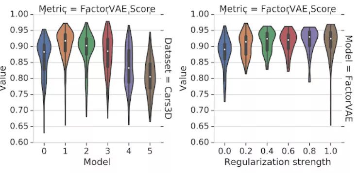 左侧的图展示了不同解耦模型不同模型在 Cars3D 数据集上的 FactorVAE 分数分布。右侧的图展示了 FactorVAE 模型在不同正则化强度下的分数分布。主要的结论为这些提琴图有很大程度的交叉,即所有的模型都很依赖于随机种子的选择。