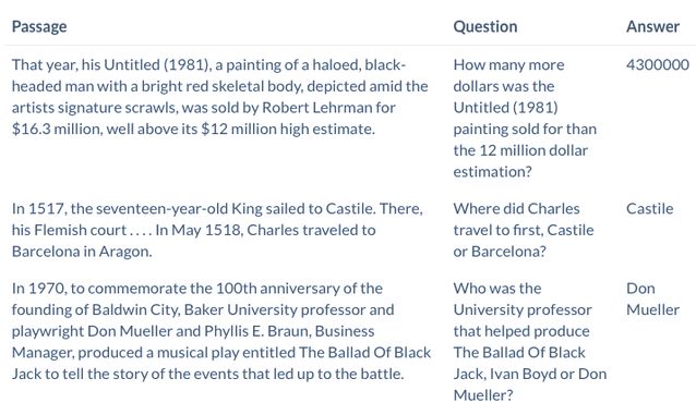 DROP 数据集中的一些文本、问题和对应的答案。可以看出,模型需要进行对数值进行加减、按年代排序、或进行因果推理。