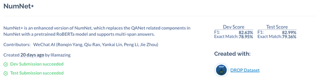 从模型效果来看,在 DROP 榜单上取得的效果是非常惊艳的。在测试集上,完全匹配(Exact Match:EM)分数达到了 79.36%。而 F1 分数更达到了将近 83%,高出第二名一个点以上。