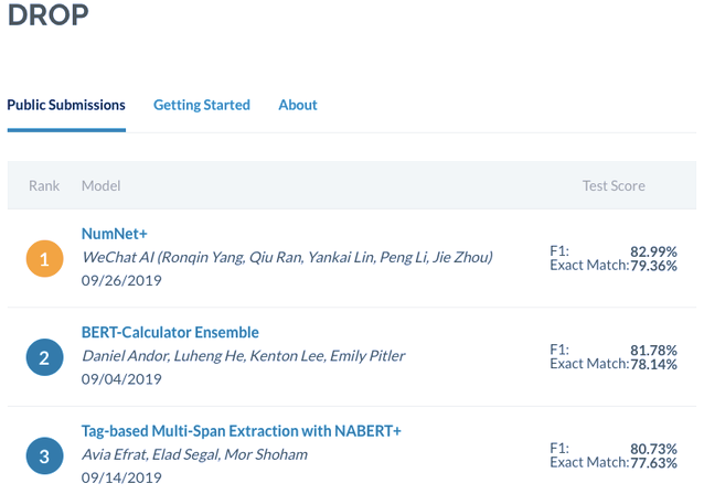 DROP 榜单是艾伦 AI 实验室设立的一个类似于 GLUE 榜单的排名,参与者需要按照要求的格式将模型打包为 Docker 镜像后上传,由网站自己将测试集放到模型中进行测试,以此保证公平性。同时,DROP 严格限制参与者每周仅能上传一次,以防刷榜。
