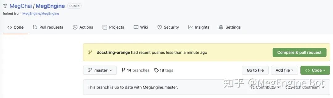 点击 "Compare & pull request",此时会创建一个从你的分支到上游 MegEngine 主分支的 Merge 请求。在描述中需要说明做了什么样的相关改进,并 Link 对应的 Issue: