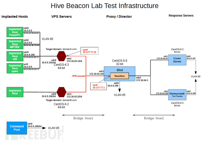 HIVE的攻击原理为通过军工商诺斯·格鲁曼(Northrop Grumman)研发的代理架构BLOT和一个名为Switchblade的中间架构,在入侵目标与CIA远程控制端进行隐蔽通信和管理控制。其中,所有的C&C通信又通过BLOT架构配置的Apache服务器和域名中转脚本进行回连控制,而且为了增强隐蔽性,所有HIVE使用的IP地址都可以在VPS系统内完成重定向动作。