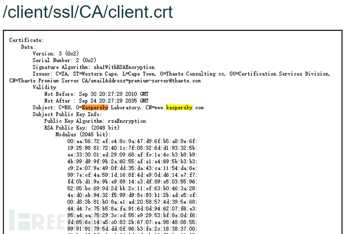 有意思的是,在Vault8曝光的HIVE源代码中,在目录/client/ssl/CA/下存在这样一个伪装成卡巴斯基公司的客户端认证证书client.crt,该证书的签发机构为Thawte Premium Server CA数字证书公司。