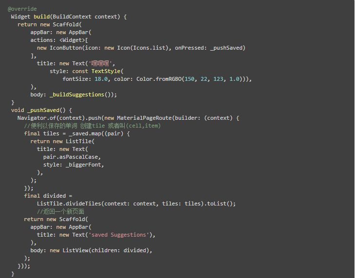 当用户点击导航栏中的列表图标时,建立一个路由并将其推入到导航管理器栈中。此操作会切换页面以显示新路由在MaterialPageRoute的builder属性中构建,builder是一个匿名函数。