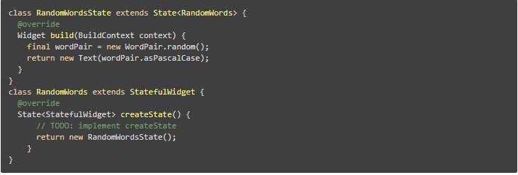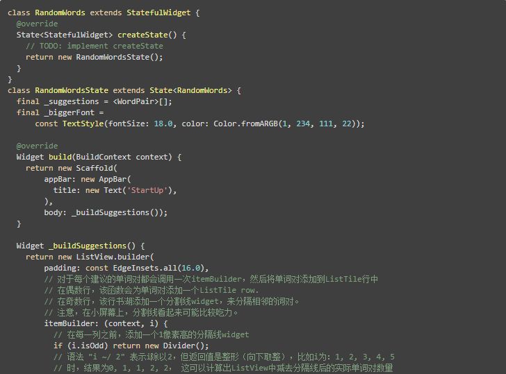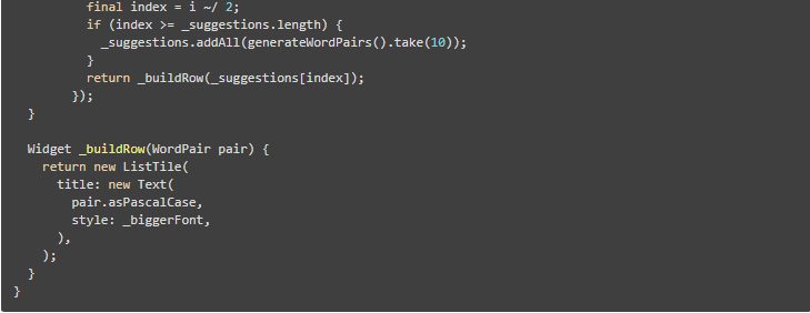 扩展(继承)RandomWordsState类,以生成并显示单词对列表。 当用户滚动时,ListView中显示的列表将无限增长